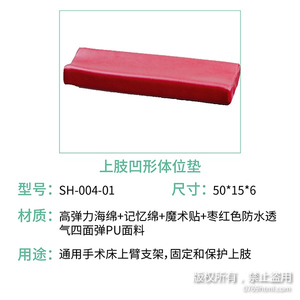 蒙泰護理凹形體位墊有上肢用凹形體位墊們也有下肢用凹形體位墊,選用棗紅色四面彈面料,防水透氣,海綿選用高彈力海綿和記憶棉組合拼接,既能做到支撐也能達到減壓效果。上肢凹形體位墊通用于手術床上臂支架,固定和保護上肢。下肢凹形體位墊俯臥位時支撐保護膝關節(jié)。