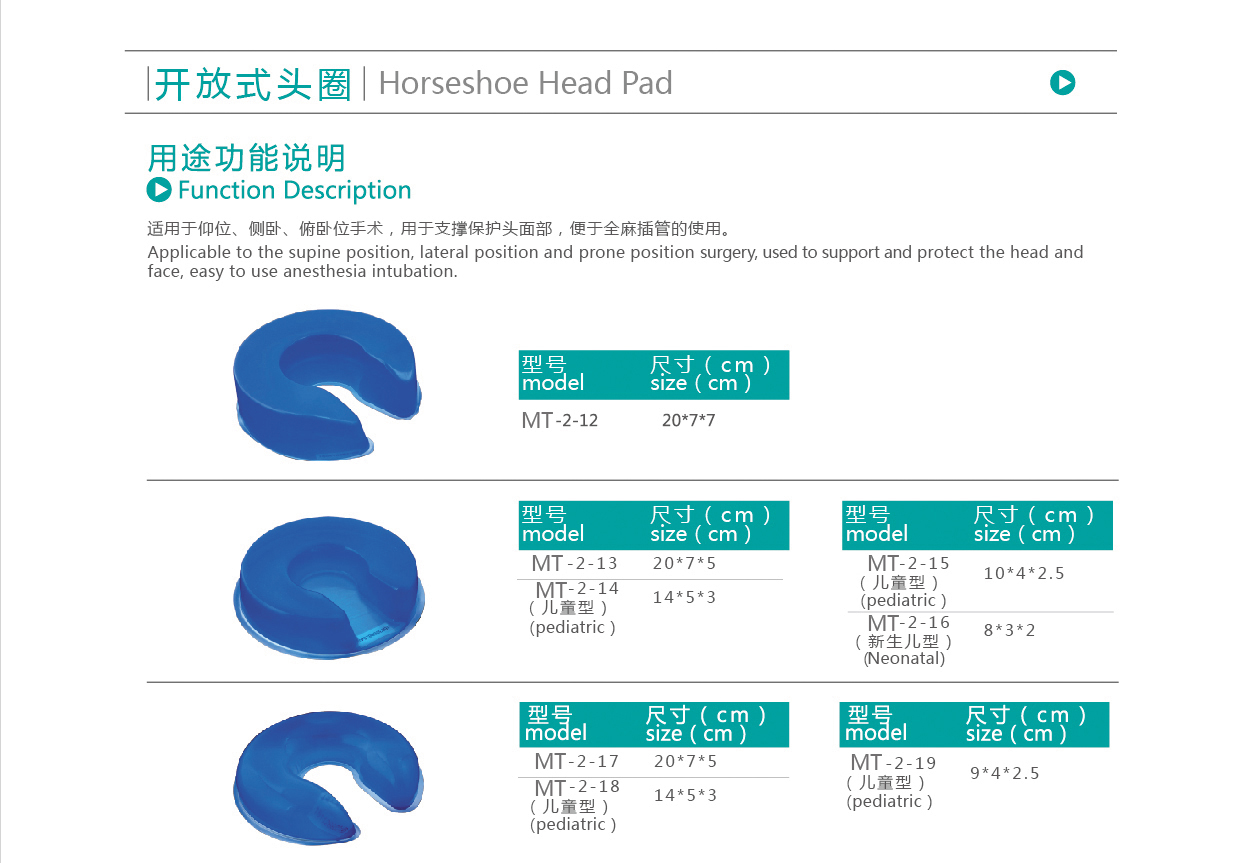 【產(chǎn)品用途】:適用于仰位、側(cè)臥、俯臥位手術(shù),用于支撐保護頭面部,便于全麻插管的使用。