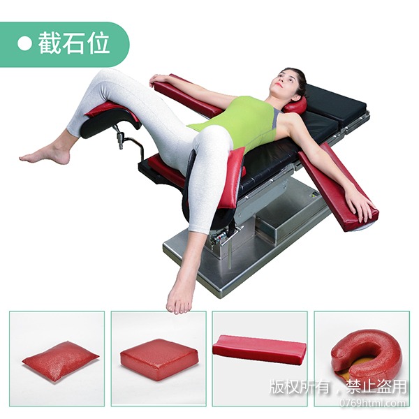 身體:將患者身體放置于手術(shù)床上,臀部齊手術(shù)床緣,兩腿屈髖、雙膝置于腿架上,兩腿間角度約為60-90°。