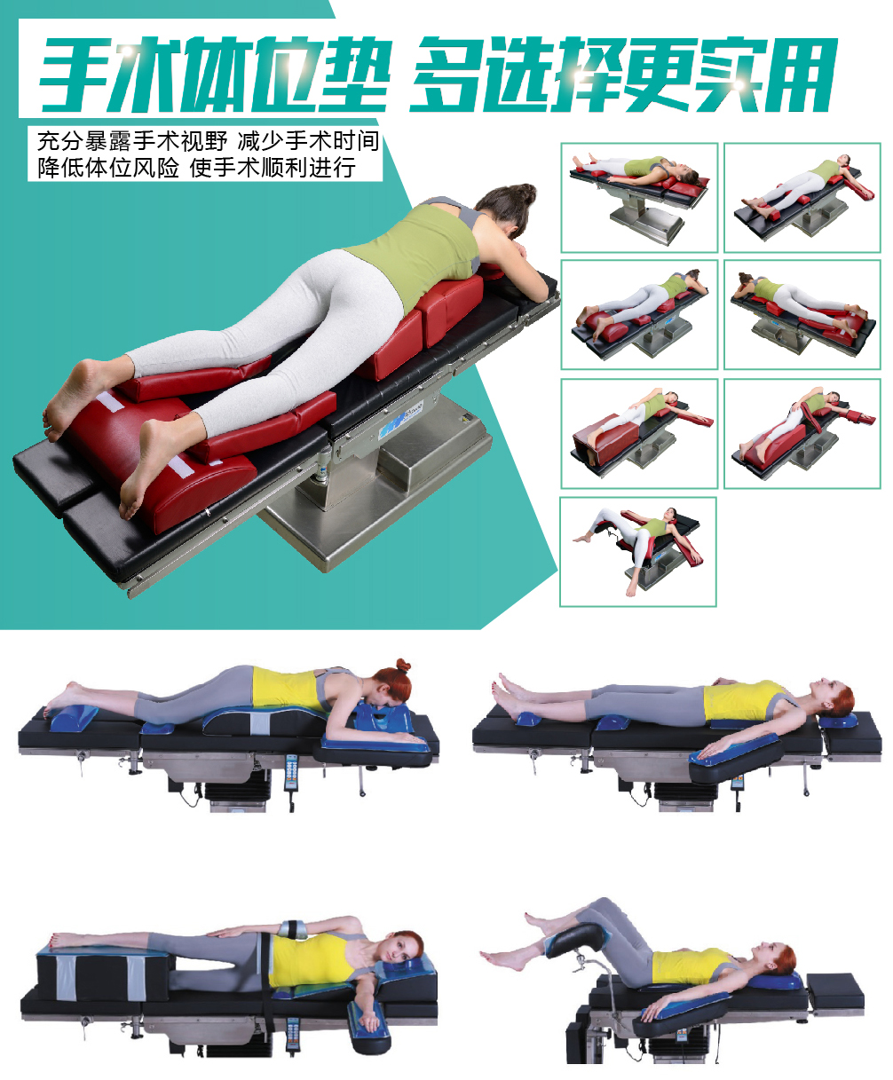 俯臥位手術(shù)包含胸墊、髂嵴墊、腿墊等組件,貼合胸腹部、髂腰部及下肢生理曲線,保障手術(shù)過程中呼吸通暢與體位穩(wěn)定;側(cè)臥位搭配隧道墊,滿足胸廓、骨科手術(shù)的軀體固定與減壓需求,減少術(shù)中體位偏移;甲狀腺手術(shù)用頸部支撐墊,貼合頸部生理弧度,既能穩(wěn)定體位,又能充分暴露手術(shù)視野,為手術(shù)開展提供助力。